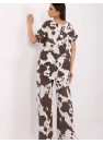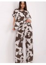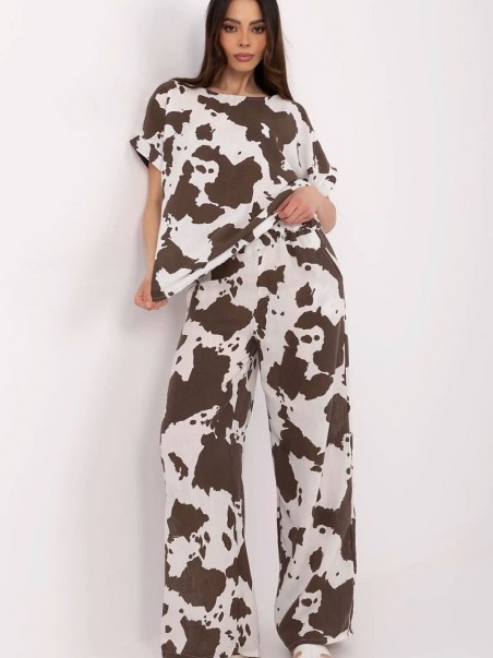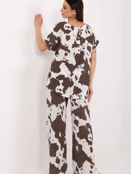 Un ensemble féminin élégant, parfait pour les tenues quotidiennes, alliant confort et allure à la mode. Il se compose d'un chemisier et d'un pantalon large qui mettent parfaitement en valeur la silhouette. Le chemisier à manches courtes et col rond est orné d'un motif animal subtil qui confère à l'ensemble un caractère unique. Le pantalon taille haute, à jambes larges, assure confort et liberté de mouvement. Une bande élastique à la taille s'ajuste joliment à la silhouette, et les poches latérales insérées sont un ajout pratique. Des boutons décoratifs sont placés sur le dos du chemisier, constituant un détail intéressant ajoutant de l'élégance. Fabriqués à partir d'un mélange de coton, de lin et d'élasthanne, ces matériaux garantissent un confort toute la journée. L'ensemble idéal pour les sorties quotidiennes, où le style et le confort sont importants.