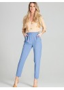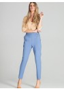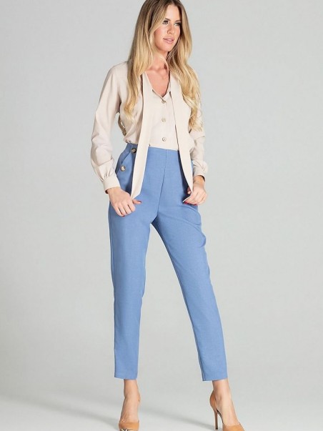 Pantalon bleu à jambes légèrement fuselées. Taille haute, poches obliques avec boutons décoratifs, fermeture éclair couverte sur le côté.