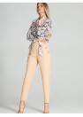 Pantalon beige à jambes légèrement fuselées. Taille haute, poches obliques avec boutons décoratifs, fermeture éclair couverte sur le côté.