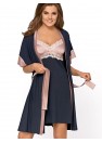 Une robe de chambre élégante avec une coupe kimono à la mode. Fabriqué en viscose douce. Décoré d'une garniture en satin et d'une ceinture en satin pour accentuer la taille en même temps. Elle est extrêmement intrigante et extrêmement féminine. Emballé dans une belle boîte de marque.