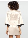 Ravissante robe de chambre faite d'une combinaison de satin dans une belle teinte champagne et de dentelle noire, sensuellement transparente. Il présente une coupe ample, nouée à la taille, qui vous apportera immédiatement un confort total et soulignera sensuellement vos charmes. Manches kimono, décorées de dentelle. Le produit est emballé dans la boîte du fabricant.