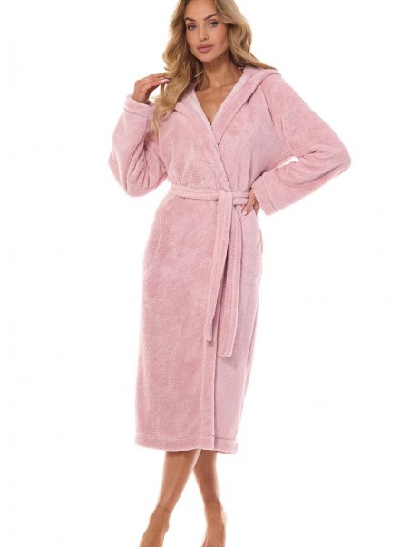Peignoir fabriqué à partir d'un tissu lisse, parfait comme vêtement d'intérieur, assure le confort grâce à sa coupe ample. Doté d'une capuche avec une partie intérieure décorative et de poches pratiques. Les manches longues avec des poignets ajoutent de l'élégance et la ceinture permet un ajustement parfait. Produit polonais, soigneusement emballé dans un sac élégant. La haute qualité de fabrication garantit la durabilité et le confort.