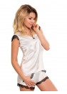 Cet ensemble inhabituel en satin décoré d'une belle dentelle plaira à de nombreuses dames élégantes. Le haut est une chemise avec des manches papillon en dentelle et un décolleté pointu couronné d'un petit nœud. Le bas est constitué d'un short avec deux poches confortables en dentelle. L'ensemble est très subtil, féminin avec une touche de flirt, idéal pour un cadeau. Les sous-vêtements sont emballés dans une belle et grande boîte (parfaite pour un cadeau).