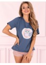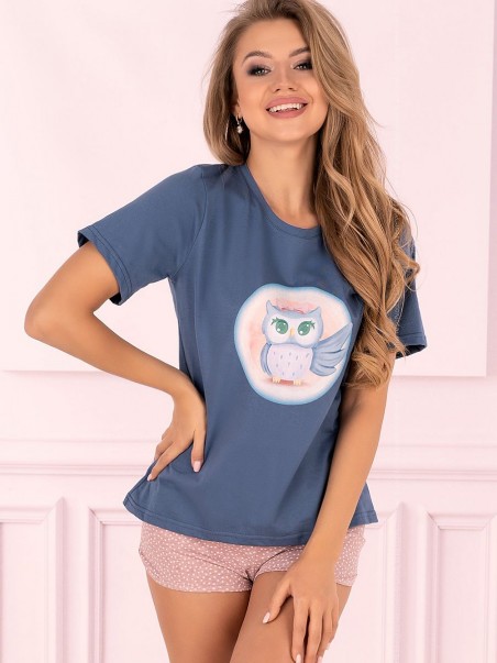 Joli pyjama deux pièces en coton, d'une adorable couleur bleu-rose. Top sous la forme d'un t-shirt pratique avec un imprimé hibou au centre. Short sur élastique, de couleur rose, décoré d'un imprimé clair.