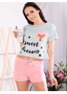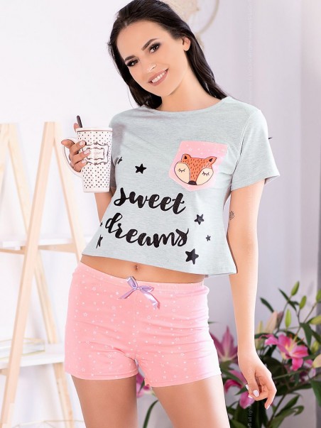 Doux et sexy ! Cet ensemble pyjama deux pièces pour femme est tout en douceur. Le haut est un t-shirt court en gris avec un imprimé renard sur la poche. Il y a également l'inscription "Sweet dreams" sur le devant. Le short en rose avec un imprimé délicat et un nœud à la taille est un classique, très bonne proposition.