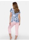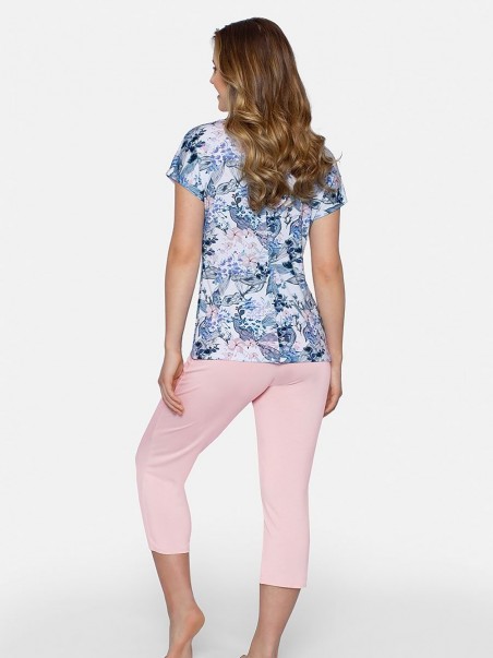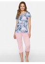 Pyjama pour femmes aux couleurs pastel. L'ensemble comprend un chemisier à manches courtes couvrant les épaules. Elle est cousue en viscose imprimée de la plus haute qualité. Un pantalon 3/4 classique et droit dans une belle couleur rose chaude. Les délicats motifs printaniers, l'encolure bateau et la coupe légèrement allongée de la blouse la rendent unique.