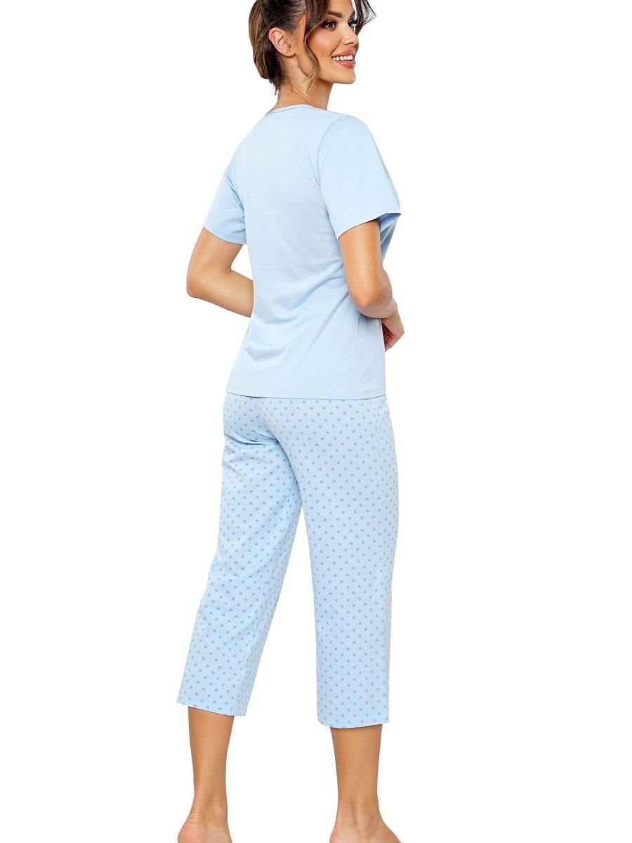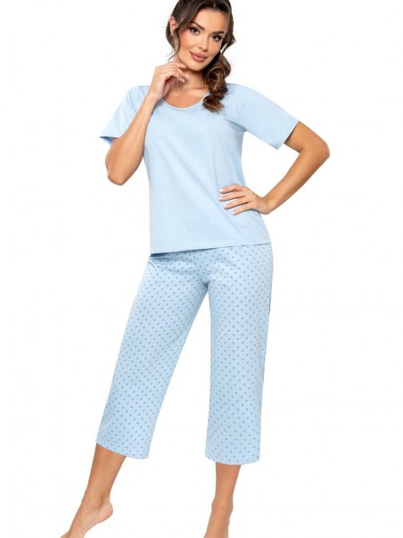 Cette charmante pyjama est une proposition pour les femmes qui apprécient le confort et les matériaux naturels. Fabriqué en coton doux et respirant, le pyjama est très agréable au toucher et assure un confort pendant le sommeil. Le haut dans une belle couleur bleue a des manches légèrement allongées qui cachent les imperfections éventuelles et lui ajoutent du charme. Le tissu lisse et la coupe classique font que le haut est polyvalent et s'adapte à de nombreuses tenues. Les pantalons à la longueur 3/4 dans un motif à pois à la mode sont le parfait mélange de confort et de style. La taille élastique assure un ajustement parfait, et la coupe ample ne restreint pas les mouvements pendant le sommeil. Ce pyjama en coton est un incontournable dans la garde-robe de toute femme qui apprécie le confort et les matériaux naturels. Son apparence charmante et ses détails pratiques en font l'option idéale pour de nombreuses nuits.
