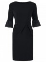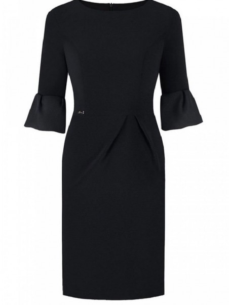 Robe simple avec des manches 3/4 terminées par un volant. La robe se ferme par une fermeture éclair.