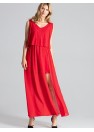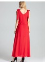 Robe rouge longue et sensuelle sans manches, nouée aux épaules avec un grand décolleté profond. La partie supérieure de la robe est décorée d'un tissu aéré. Taille avec un élastique cousu, sur le côté gauche il y a une fente à partir de la taille. En dessous, une robe partiellement ajustée dont le bas est légèrement évasé avant le genou.