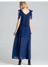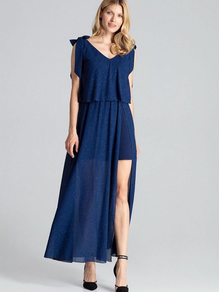 Robe longue sensuelle sans manches, bleu marine, nouée aux épaules avec un grand décolleté profond. La partie supérieure de la robe est décorée d'un tissu aéré. Taille avec un élastique cousu, sur le côté gauche il y a une fente à partir de la taille. En dessous, une robe partiellement ajustée dont le bas est légèrement évasé avant le genou.