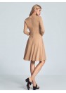 Robe midi de cocktail beige avec un col en V, des manches 3/4, des pinces au niveau du buste, une couture à la taille et un bas évasé. Fermeture à l'arrière avec une fermeture éclair couverte.