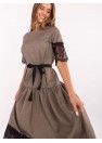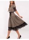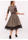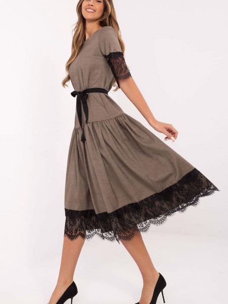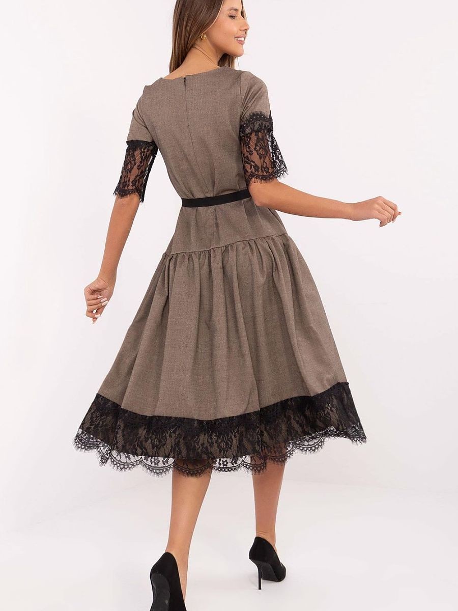 Une robe de cocktail élégante et stylée, parfaite pour différentes occasions, des réunions d'affaires aux réceptions officielles. Fabriquée en laine de haute qualité, elle garantit un confort de port et un look élégant toute la journée. La coupe évasée met en valeur la silhouette, tandis que la longueur midi ajoute de la classe et de la subtilité féminine. Les manches courtes en dentelle délicate et la finition en dentelle décorative en bas confèrent à la robe un caractère unique. Le décolleté rond met en valeur le cou, et la ceinture à nouer à la taille permet un ajustement parfait à la silhouette. La robe se ferme par une fermeture éclair dissimulée, assurant ainsi confort et esthétique. C'est le choix idéal pour les femmes qui apprécient l'élégance et le style intemporel!