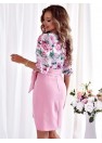 Une élégante robe avec un décolleté cache-cœur, une manche jusqu'au coude et un nœud décoratif à la taille. Le haut de la robe est fait de tissu à fleurs colorées, le bas avec des plis décoratifs dans une couleur unie de rose sale.