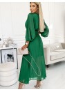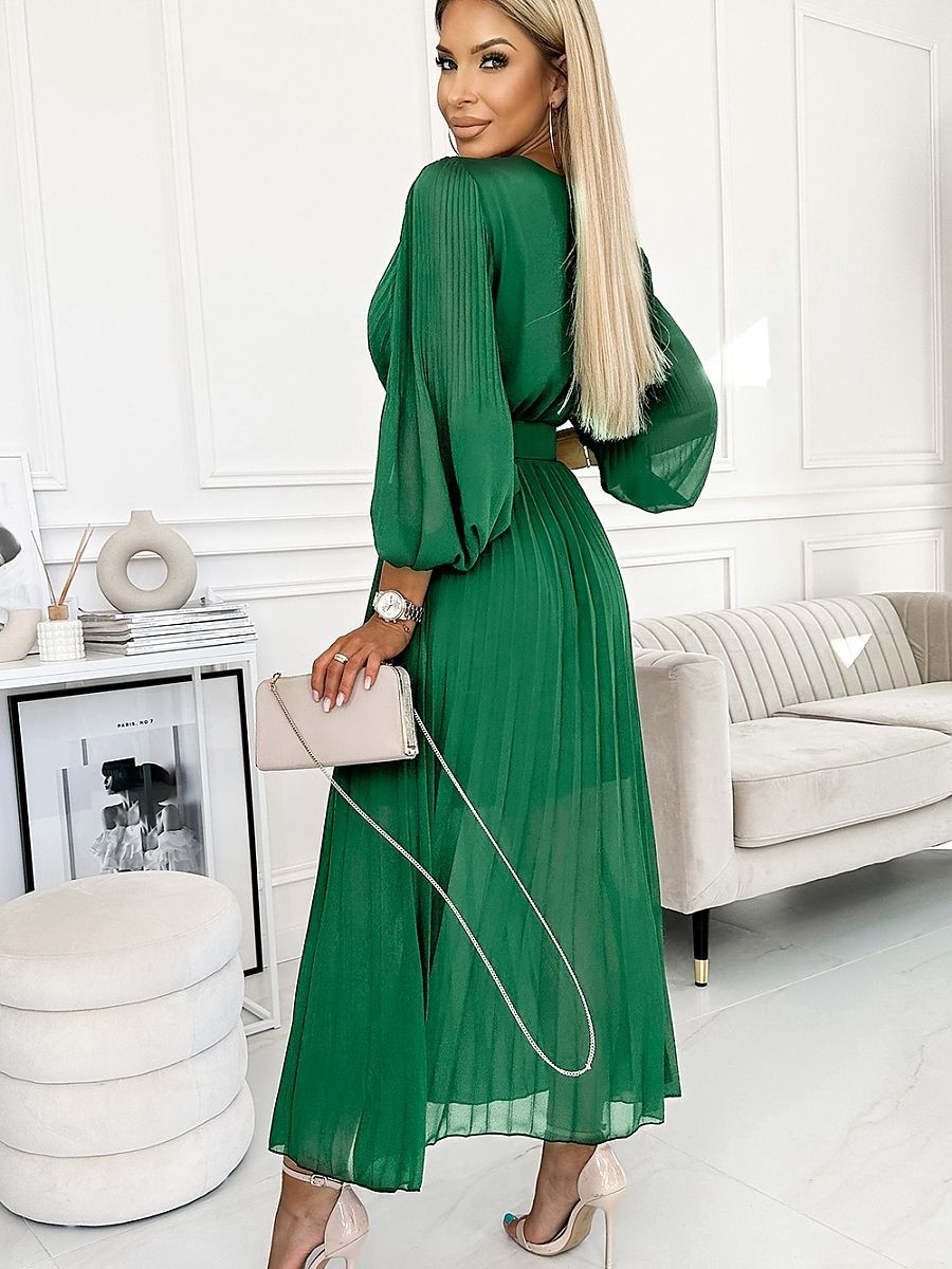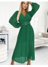 Robe en mousseline de soie plissée avec encolure, manches longues et ceinture. Les plis sur l'encolure et les manches ajoutent de l'élégance à la robe. Robe en vert clair. Marque numoco.