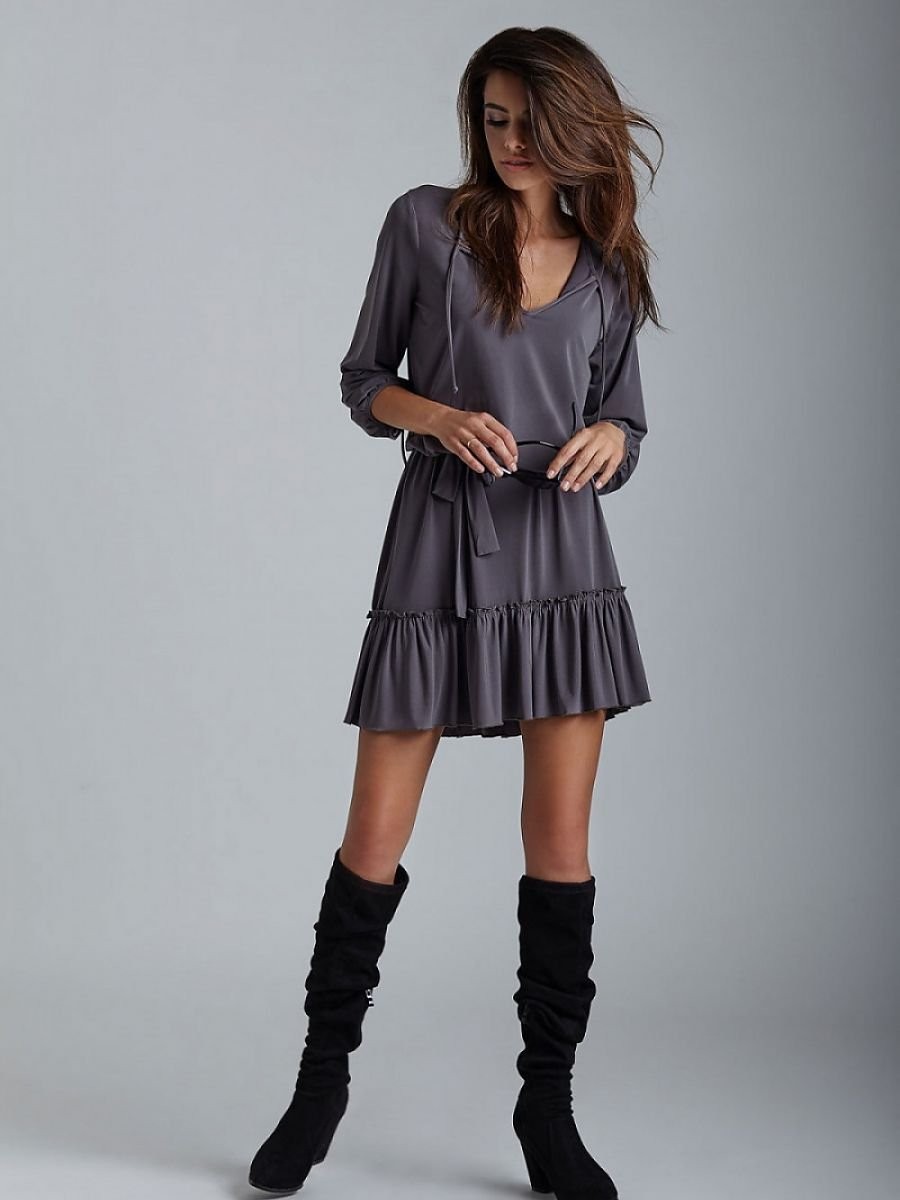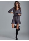 Robe ample avec un volant dans le bas qui donne à la robe un aspect légèrement romantique. Taille soulignée par une ceinture qui peut être nouée de n'importe quelle façon. Manches 3/4 terminées par un pli et des cordons. Encolure ronde avec une larme avec la possibilité de la nouer en un nœud. Un choix parfait pour une tenue de tous les jours, ainsi que pour le travail ou une réunion entre amis. Se marie bien avec des talons aiguilles, des baskets, des bottes ou même des bottines.