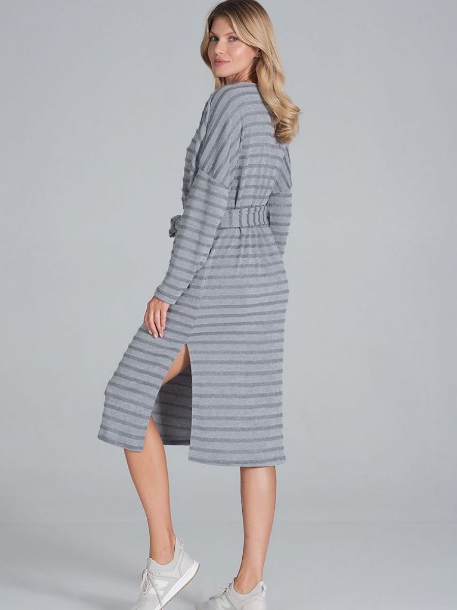 Robe midi d'hiver chaude, encolure demi-ronde, manches longues, coupe droite. Noué à la taille, fentes sur les côtés.