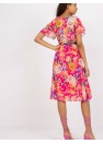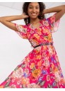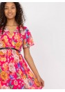 Robe d'été en tissu floral avec une coupe évasée. Robe à manches courtes, encolure enveloppante, ourlet plissé. La robe est doublée et munie d'une ceinture.