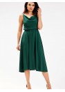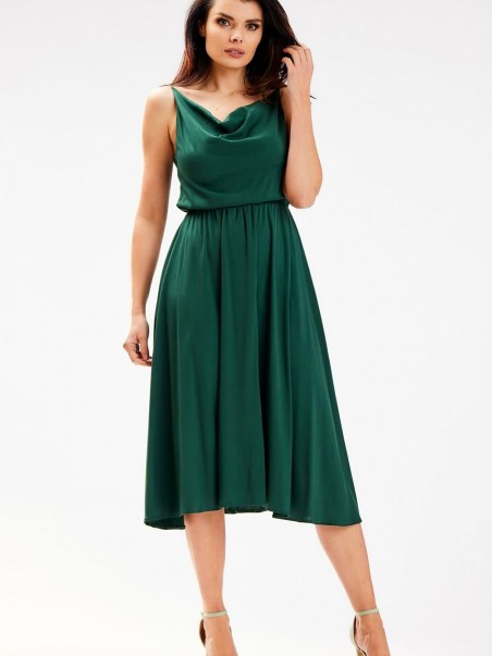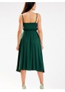 Élégante robe midi à fines bretelles. L'encolure de la robe est plissée et fluide. La taille est plissée avec un élastique pour s'adapter à la silhouette. Conçue et cousue en Pologne.