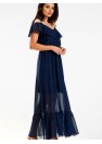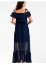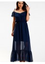 Robe longue avec une encolure à l'espagnole. Le haut de la robe est décoré d'un volant. Un élastique souligne la taille. La robe est cousue en mousseline de soie aérienne qui s'écoule joliment lorsque vous marchez. Le bas de la robe est doublé. Conçue et cousue en Pologne.