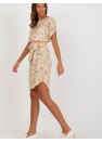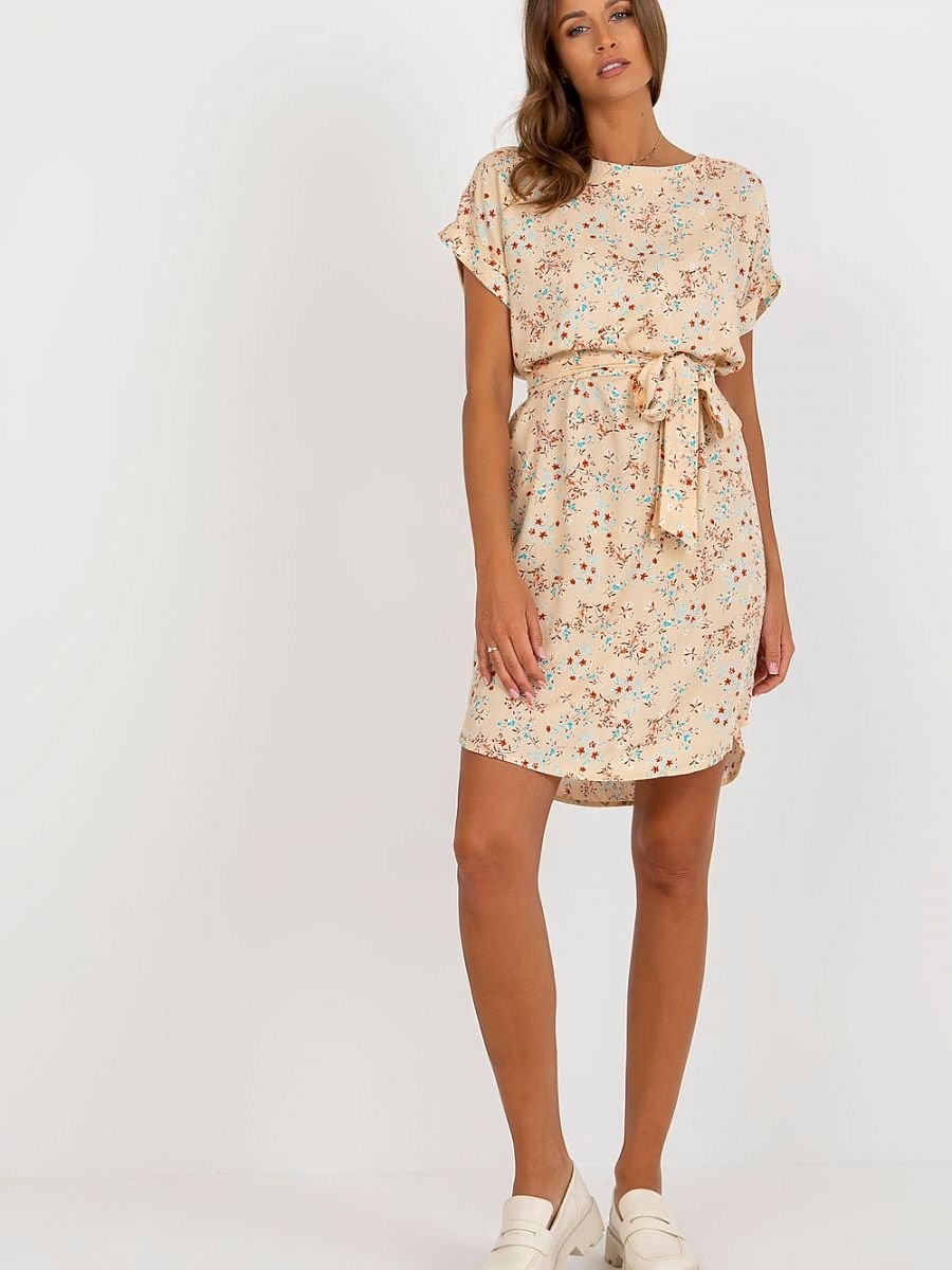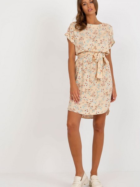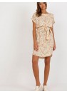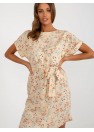 Robe d'été à manches courtes et encolure ronde. Ceinture à nouer à la taille. Robe en tissu avec un motif floral intéressant.