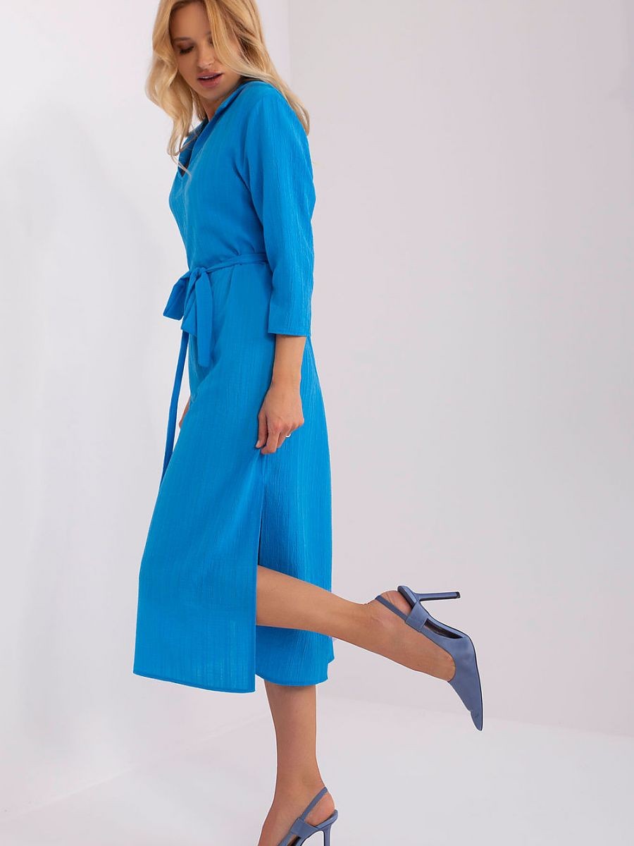 Robe à coupe droite avec manches 3/4, lien à la taille et fentes latérales. Une proposition pour tous les jours et au-delà.