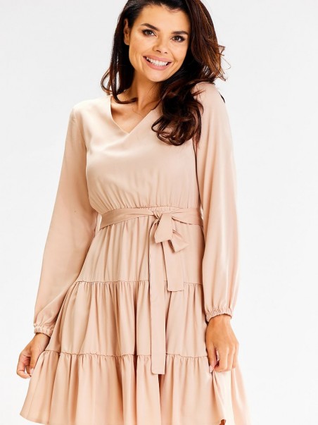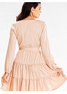 Robe à manches longues avec des volants qui donnent à l'ourlet un aspect évasé. La robe est dotée d'un élastique cousu à la taille pour une coupe ajustée, et est également nouée par une ceinture. Parfaite pour de nombreuses occasions.