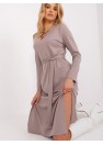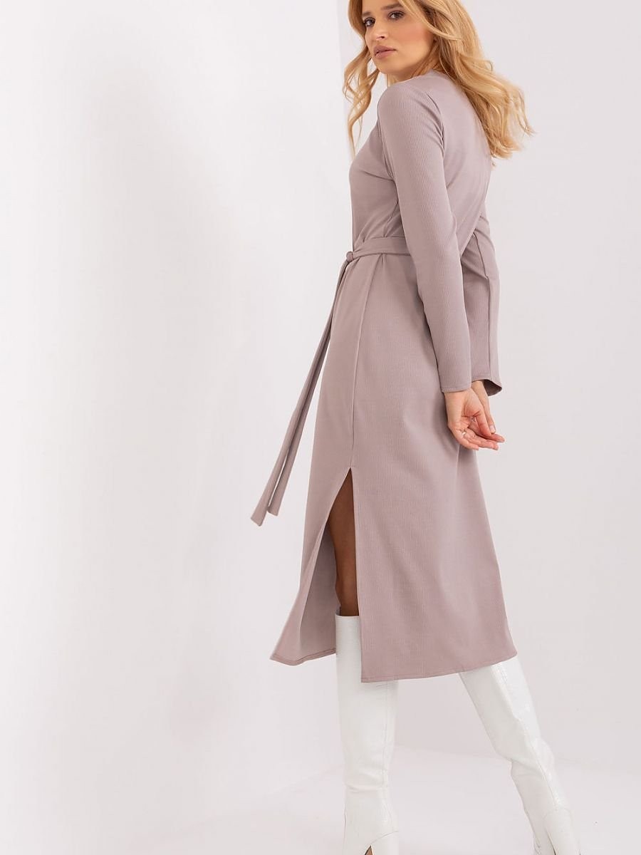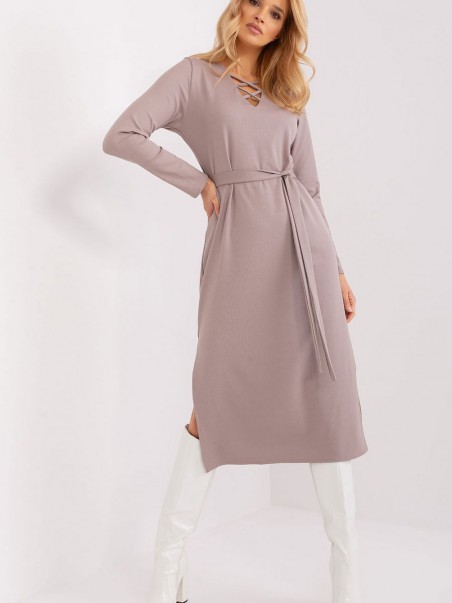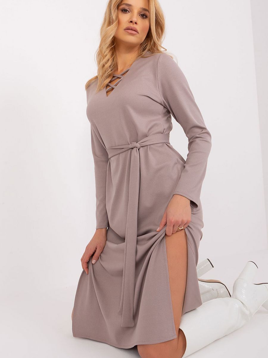 Robe à manches longues avec encolure en forme de cœur. L'encolure est ornée d'un laçage décoratif, la robe est livrée avec une ceinture à nouer. Fente séduisante sur un côté. La robe est confectionnée dans une matière côtelée. Idéale pour de nombreuses occasions.