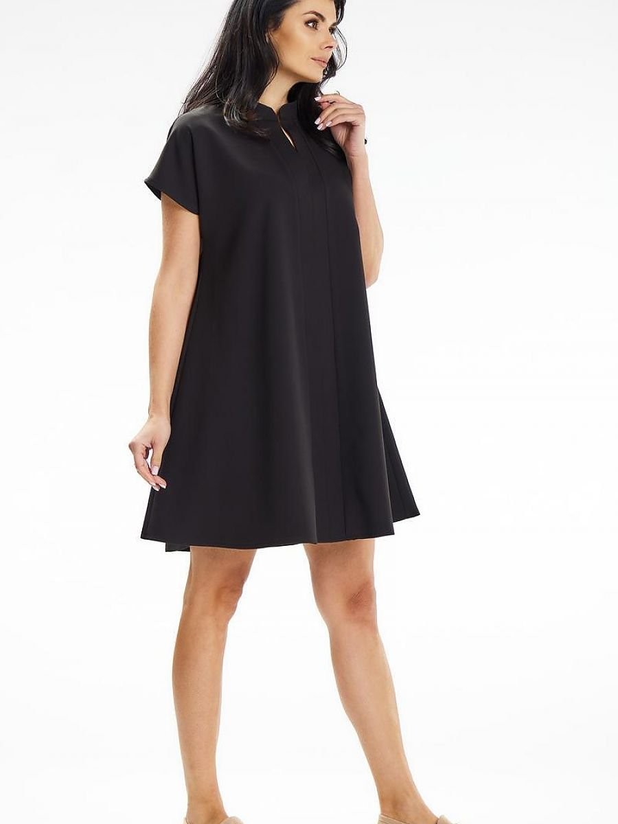 Mini robe trapèze à manches courtes et devant surpiqué. Le modèle présente un col montant et une fente à l'encolure. Idéale pour un rendez-vous, une sortie ou pour un style quotidien.