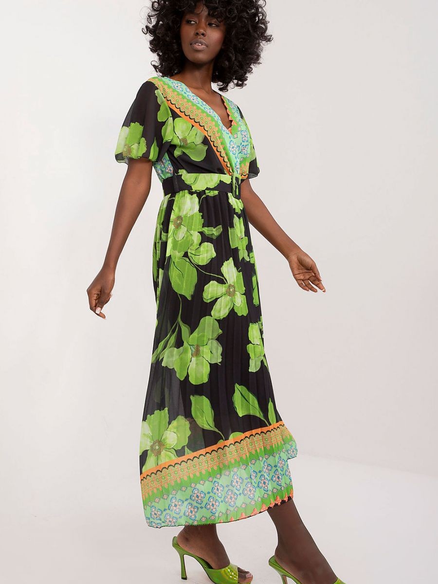 Robe d'été à manches courtes en forme de volants. Robe doublée. Encolure enveloppante, ceinture à boucle à la taille, ourlet plissé. Idéale pour de nombreuses occasions.