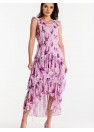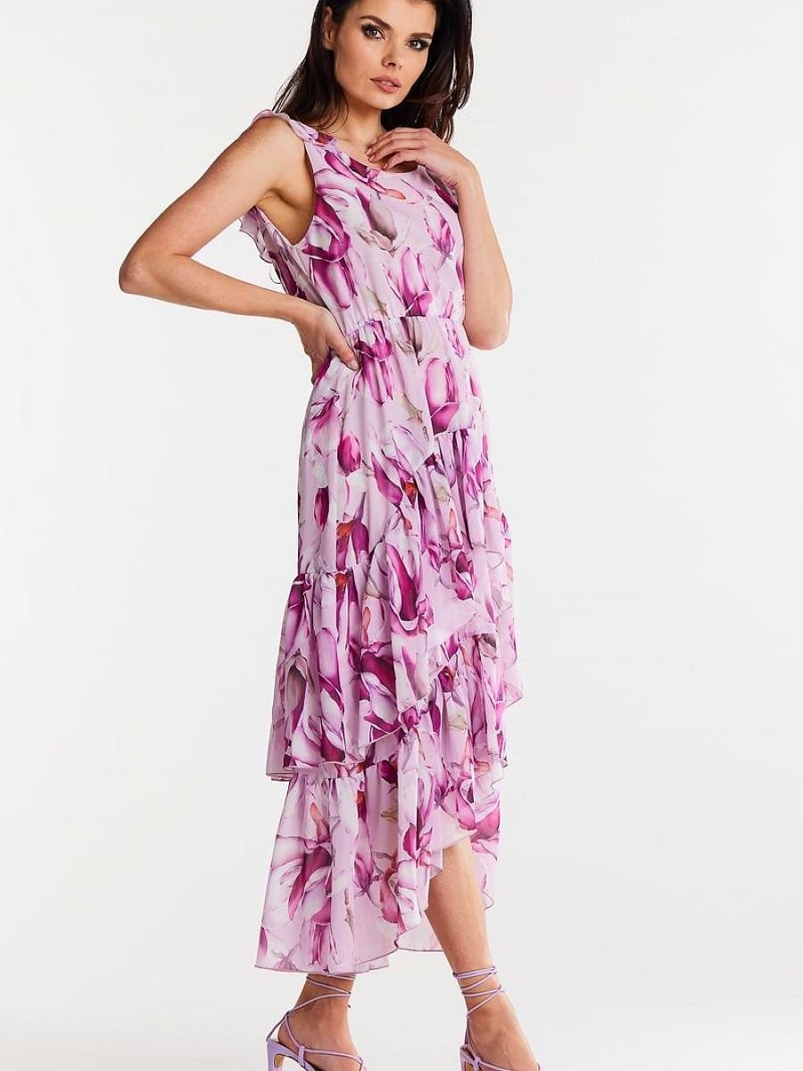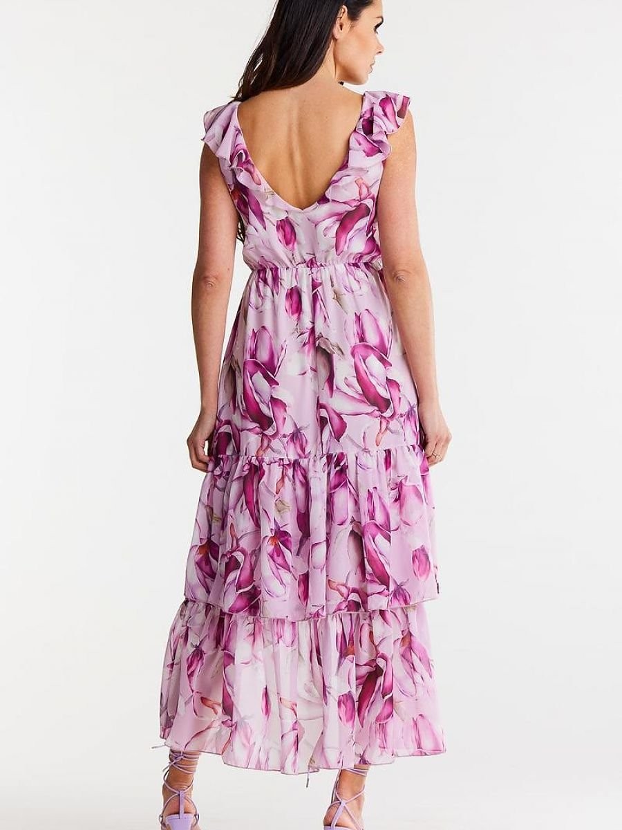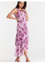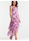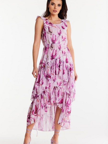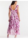 Robe en mousseline avec doublure élastique, décorée dans le bas de deux volants, asymétriques. L'encolure au dos est également décorée d'un volant et est fortement échancrée. La robe est dotée d'un élastique cousu à la taille pour un ajustement parfait.