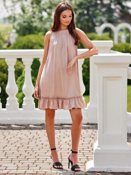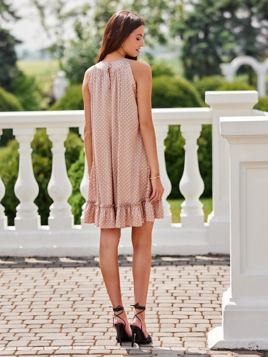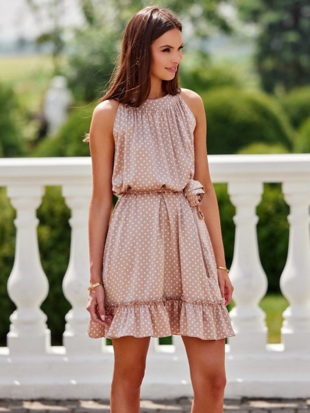 La robe Mila a été confectionnée dans un tissu agréable avec de minuscules pois qui ajoutent une touche girly. La robe présente une encolure dos nu qui dévoile et met en valeur les épaules. Le bas de la robe est orné d'un simple volant qui apporte une touche de légèreté et de féminité. Elle se ferme dans le dos à l'aide de deux boutons décoratifs fixés au niveau du cou. La robe est livrée avec une ceinture ornée d'une rose décorative qui permet de la porter de deux façons, en chute libre sans ceinture ou nouée à la taille. La robe Mila est le choix idéal pour les fêtes de fin d'année. Associée à d'élégants talons aiguilles, elle sera du plus bel effet lors des baptêmes, des communions et des mariages. En l'associant à des baskets ou à des tongs ajourées confortables, vous obtiendrez un style quotidien extrêmement féminin qui vous fera sortir du lot, tout en vous assurant confort et commodité. Le produit est fabriqué et cousu en Pologne.