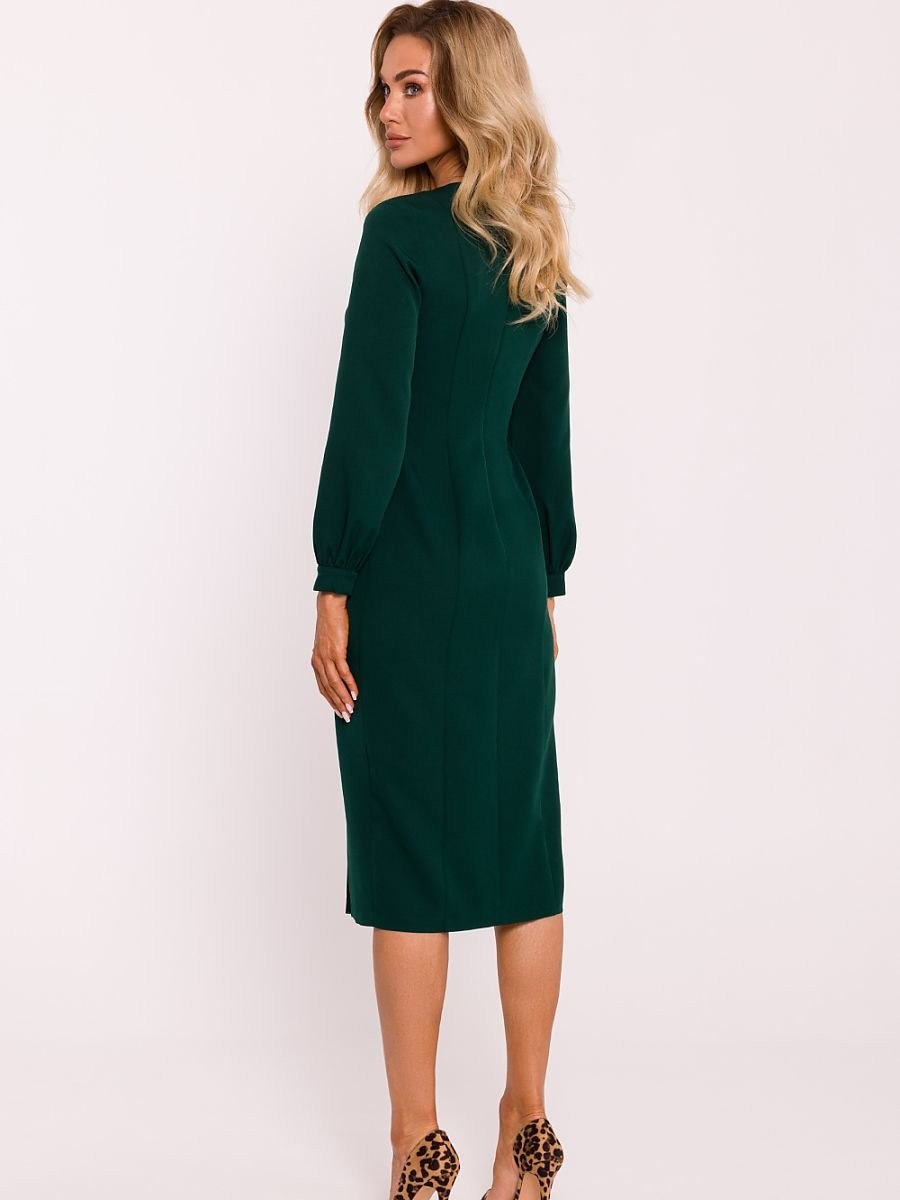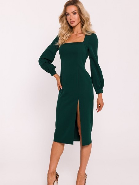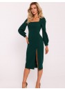 Une robe midi en tissu unicolore, dont la coupe ajustée met parfaitement en valeur la silhouette. L'élégante encolure cramoisie ajoute un charme classique, tandis que les longues manches bouffantes avec poignets à boutons recouverts apportent une touche romantique et moderne. Une fente haute sur le devant apporte un détail sensuel, tandis qu'une fermeture à glissière couverte au dos assure un ajustement confortable. Le modèle n'a pas de doublure, ce qui le rend plus léger et idéal pour de nombreuses occasions. La robe a été conçue et cousue en Pologne, ce qui garantit une grande qualité et un travail soigné.