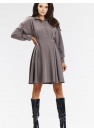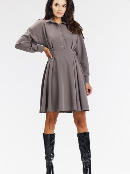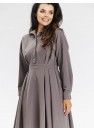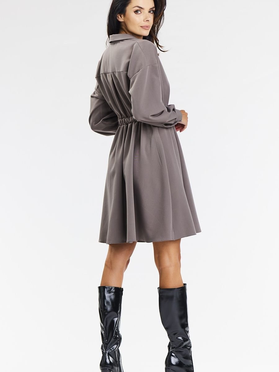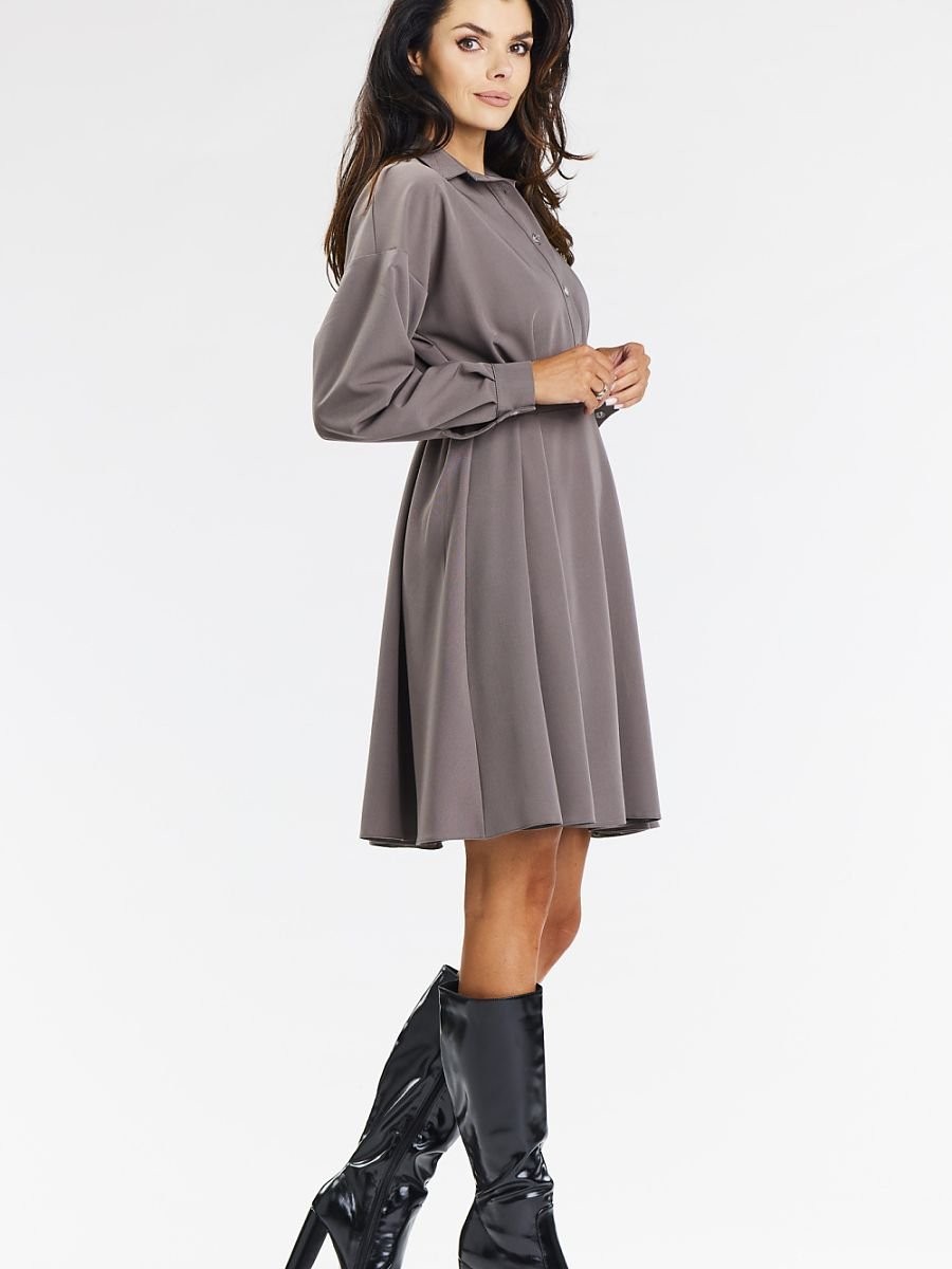 Élégante robe chemise évasée de couleur taupe. Ajoutez de l'élégance à votre garde-robe avec notre robe chemise grise, parfaite pour les occasions formelles et professionnelles. L'ourlet évasé, la longueur au genou et les manches longues terminées par des poignets soulignent la féminité et le style. Le col montant et la fermeture boutonnée sur le devant ajoutent au look moderne. La robe est boutonnée pour plus de confort et d'élégance. La couleur grise la rend polyvalente et l'associe facilement à des talons aiguilles ou à des bottes. Soigneusement cousue à partir de matériaux de haute qualité. Idéale pour les réunions d'affaires, les célébrations élégantes et les sorties formelles.
