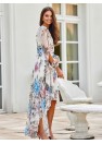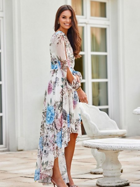 Robe asymétrique longueur maxi. Jupe évasée, haut avec un décolleté croisé et des manches bouffantes incroyablement longues avec des fentes décoratives. Manches terminées par un élastique. Robe resserrée à la taille, mettant parfaitement en valeur la région de la taille. Fermeture à glissière à l'arrière avec une légère exposition du dos. La robe a une doublure cousue, ce qui empêchera le tissu de transparent. Juste des bijoux délicats, et vous éblouirez tout autour. La coupe et la longueur seront parfaites pour toutes les silhouettes, ajoutant de la légèreté et optiquement quelques centimètres de longueur. Le tissu léger et délicat ondulera légèrement à chacun de vos mouvements, laissant une impression inoubliable. Le produit est fabriqué et cousu en Pologne.