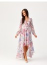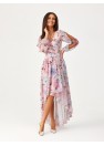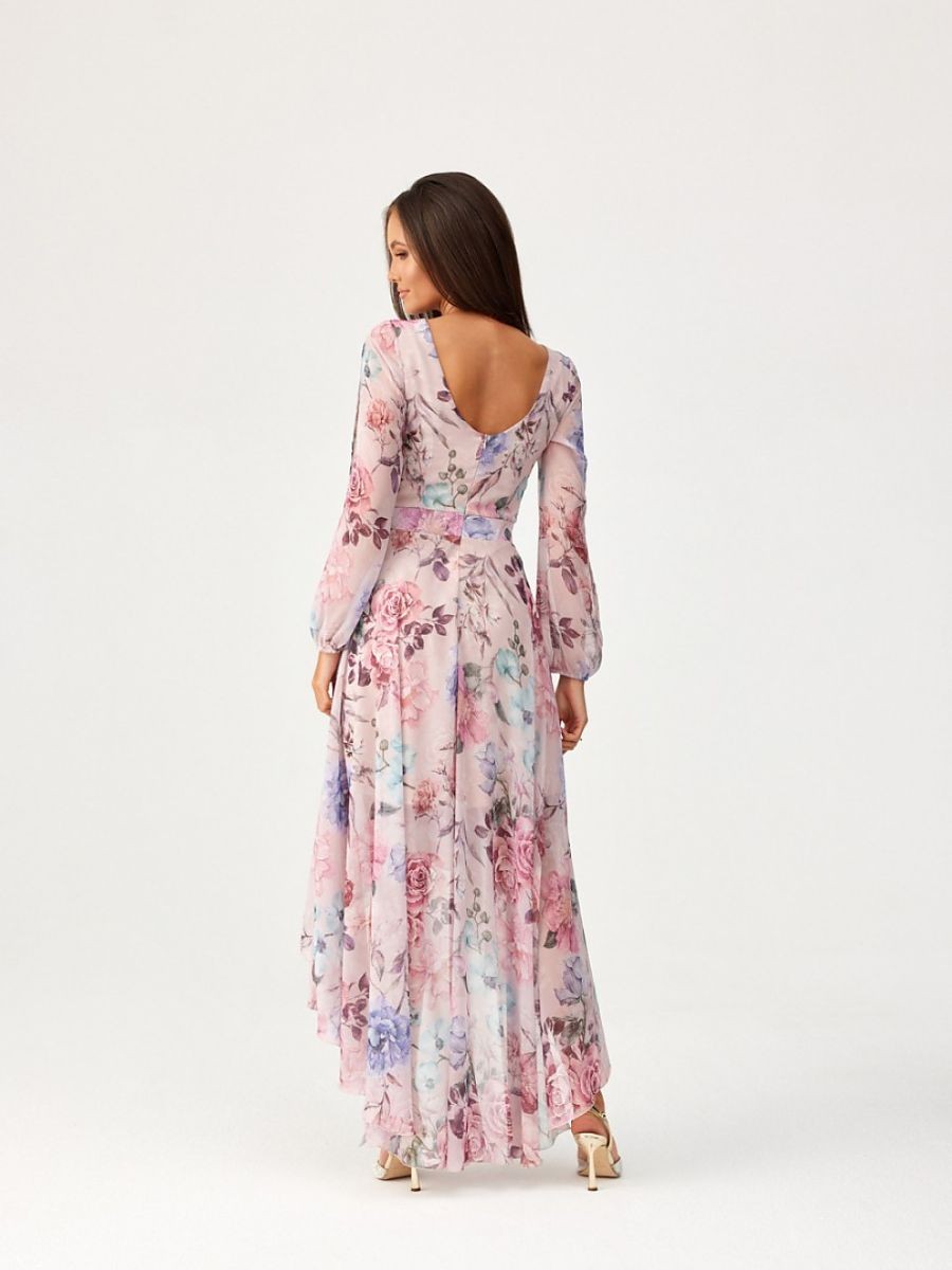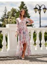 Robe asymétrique maxi longueur. Jupe évasée, haut avec décolleté croisé et incroyables manches bouffantes longues avec fentes décoratives. Manches terminées par un élastique. Robe resserrée à la taille, mettant en valeur la région de la taille. Fermeture éclair à l'arrière avec une légère exposition du dos. La robe a une doublure cousue, ce qui empêchera le tissu de transparaître. Juste des bijoux délicats et vous ravirez tout le monde autour de vous. La coupe et la longueur seront parfaites pour toutes les silhouettes, donneront à la silhouette de la légèreté et ajouteront optiquement quelques centimètres de longueur. Le tissu aérien et délicat ondulera légèrement à chacun de vos mouvements, laissant une impression inoubliable. Le produit est fabriqué et cousu en Pologne.