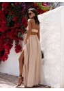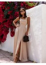 Sensuelle et légère robe longue parfaite pour les jours chauds. Le modèle avec de larges bretelles attachées autour du cou souligne subtilement les épaules et le décolleté, tandis que la taille élastique assure confort et ajustement à la silhouette. Le dos attire l'attention avec de larges découpes qui dévoilent élégamment le dos, ajoutant une touche estivale et de légèreté féminine. Un autre accent est la fente à l'avant, allant au-dessus du genou, qui donne à la robe de la liberté de mouvement et un peu de caractère. Excellent choix pour les vacances, une promenade sur la plage ou une fête estivale. Longueur de la robe mesurée à partir de l'aisselle.