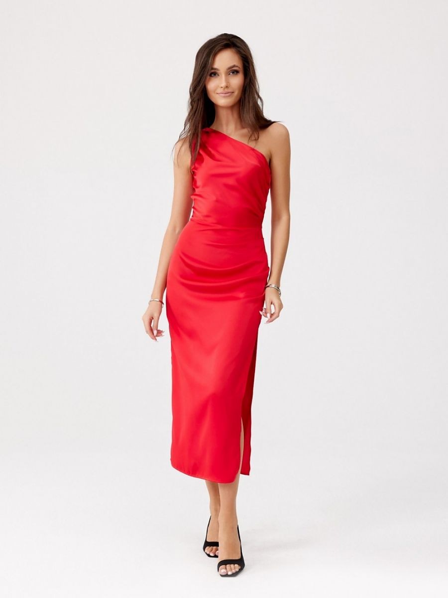 Cette robe midi à une épaule et subtilement fendue à la jambe est confectionnée dans une délicate étoffe de satin. Un pli sur le côté dissimule parfaitement les imperfections. La large bandoulière avec des plis sur une épaule lui confère un caractère unique. Elle se ferme à l'aide d'une fermeture à glissière couverte sur le côté de la robe. Cette robe midi n'est pas seulement élégante, elle est aussi fonctionnelle. La longueur midi confère à la robe un style raffiné et féminin. Cette coupe de robe vous permettra de vous sentir originale en soulignant votre style individuel et attirera certainement l'attention en vous faisant sortir du lot quelle que soit l'occasion. Le produit est fabriqué et cousu en Pologne.