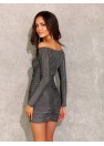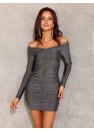 Une mini robe unique qui ne manquera pas d'attirer l'attention en toute occasion. Robe à large encolure se prolongeant par des épaules apparentes et des manches longues. La robe présente des plis décoratifs sur toute la longueur du devant et en partie dans le dos. La robe est en tissu avec des paillettes. Ce modèle de robe est une excellente option en tant que tenue complète, parfaite pour diverses célébrations. Le produit est fabriqué et cousu en Pologne.