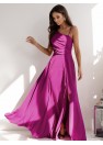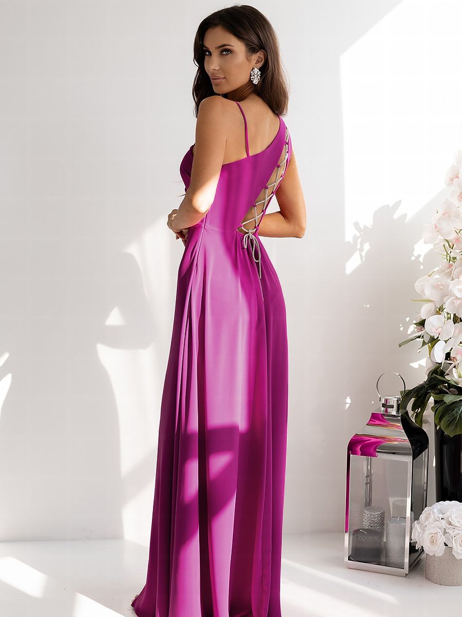 Une longue robe droite avec des bretelles asymétriques, l'une fine, l'autre plus épaisse. Robe cintrée à la taille, jupe évasée. Robe fermée par une fermeture éclair dissimulée sur le côté. Sur le dos, une fente décorative avec un laçage tressé.