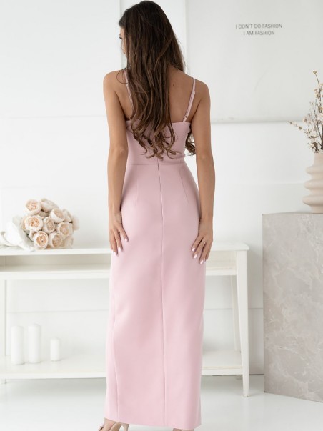 Une longue robe ajustée, fermée avec une fermeture éclair cachée. La robe a des bretelles réglables, un décolleté en portefeuille, et un bas plissé. Robe taille empire. Une proposition idéale pour de nombreuses occasions.