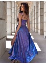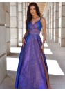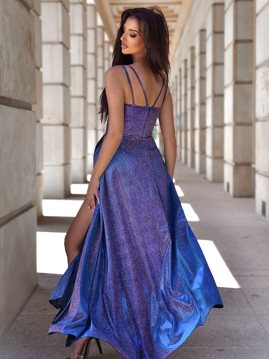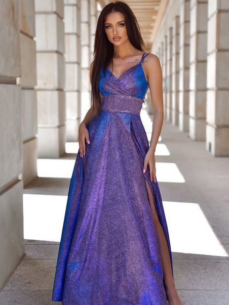 Robe longue à bretelles, avec un décolleté en V profond, cintrée sous la poitrine. Le bas est évasé avec une longue fente. Une proposition idéale pour de nombreuses occasions.