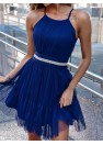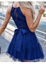 Élégante robe en tulle à bretelles avec un laçage réglable. Robe fermée par une fermeture éclair cachée. Ceinture décorative à nouer à la taille. Bas légèrement évasé.