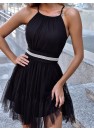Élégante robe en tulle à bretelles avec un laçage ajustable. Robe fermée par une fermeture éclair dissimulée. Ceinture décorative à nouer à la taille. Bas légèrement évasé.