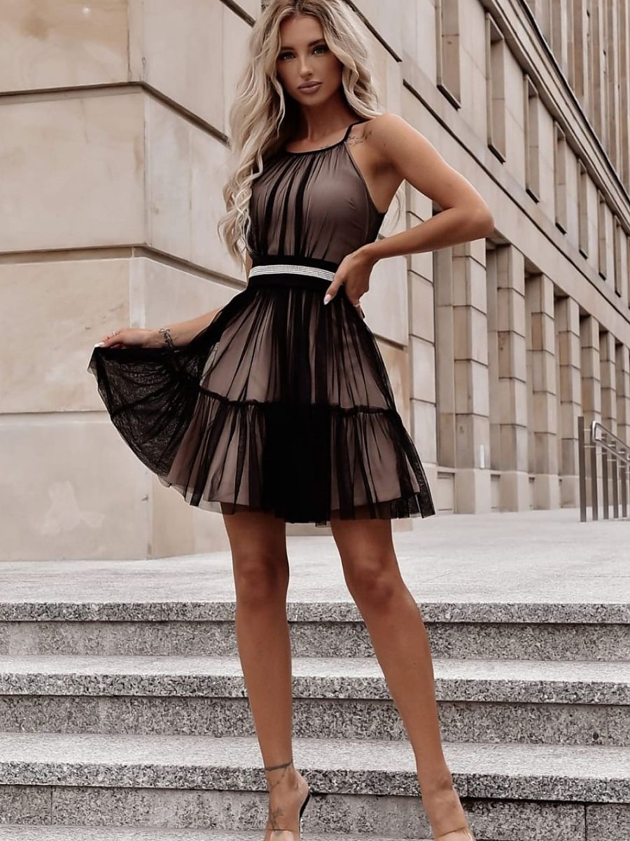 Élégante robe en tulle à bretelles avec un laçage réglable. Robe fermée par une fermeture éclair cachée. Ceinture décorative à nouer à la taille. Bas légèrement évasé.