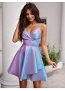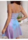 Une robe courte à fines bretelles, fermée par une fermeture éclair cachée. La robe a un profond décolleté enveloppé, cintrée sous la poitrine, le bas légèrement évasé sur un pli.