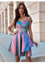 Robe courte à fines bretelles, fermée par une fermeture éclair dissimulée. La robe a un profond décolleté croisé, cintrée sous la poitrine, le bas légèrement évasé en pli creux.