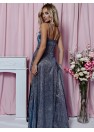 Longue robe à bretelles, avec un profond décolleté en forme de portefeuille, coupée sous la poitrine. Le bas évasé avec une longue fente. Une proposition idéale pour de nombreuses occasions.
