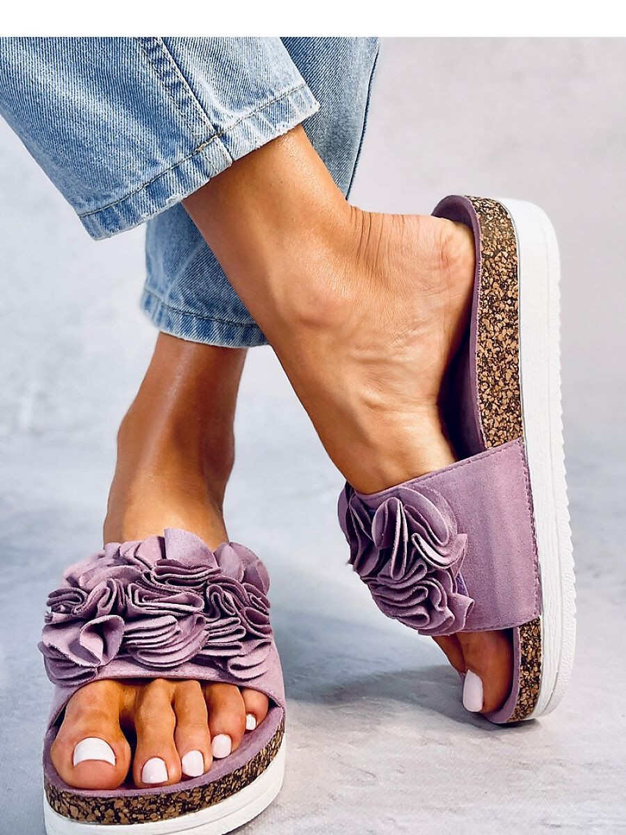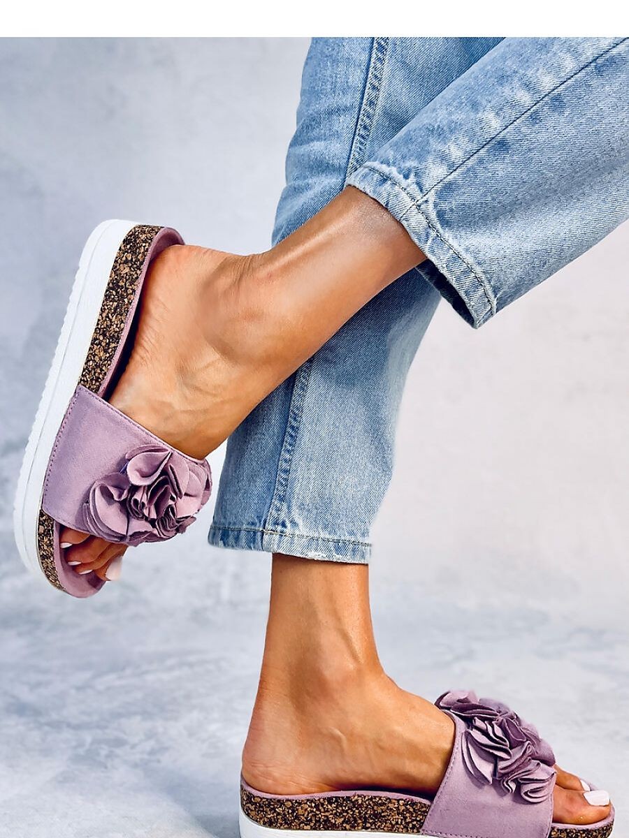 Tongs pour femmes sur une semelle haute de 4 cm. Elles sont uniques grâce à l'application florale, qui ne manquera pas de ravir vos cœurs : ) La semelle intérieure profilée vous donnera envie de les emmener à chaque fois que vous vous promènerez en vacances : ) Matière extérieure ? daim écologique.