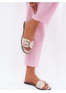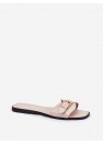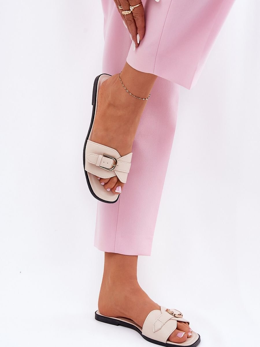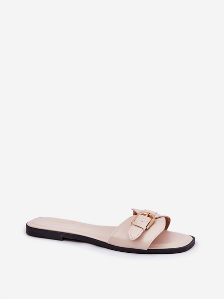 Mules pour femmes en cuir écologique, avec un talon plat. Ce modèle est orné d'une boucle dorée sur la sangle, qui leur donne une touche délicate. Parfaites pour tous les jours, ces mules se marient parfaitement avec des robes d'été, des jupes et des pantalons en tissu.