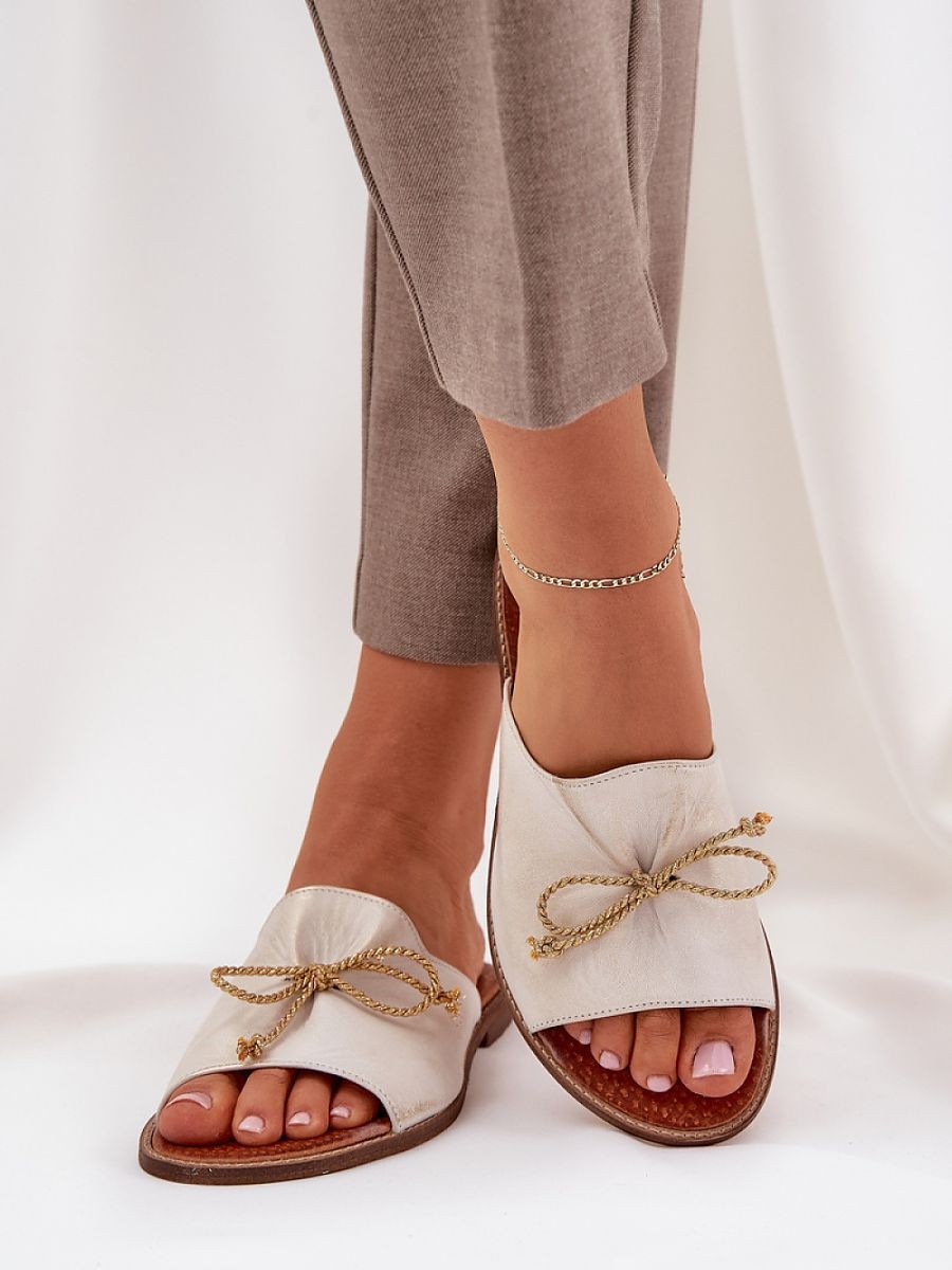 Les élégantes sandales en cuir naturel sont une proposition subtile qui allie confort et élégance. Montées sur un talon plat, elles assurent un confort tout au long de la journée. Les plis délicats sur la tige et le joli nœud leur ajoutent du charme féminin. Ces sandales seront un excellent choix pour les journées estivales, se combinant parfaitement avec des robes légères ou des tenues décontractées.
